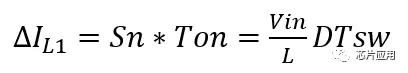 在Ton階段,輸入端與輸出端斷開,電感兩端的電壓就是Vin,所以電感電流的上升斜率為Vin/L,在Ton這段時間內(nèi),電感電流上升為公式(1)