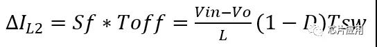 在Toff階段,電感兩端的電壓是Vin-Vo,電感電流下降斜率為(Vin-Vo)/L,電感電流的下降大小為(公式2)