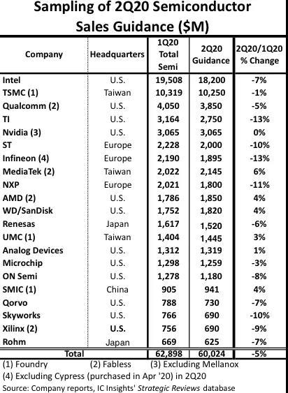 報告中稱受到疫情影響,半導體業務未來一段時間充滿不確定性,因此許多半導體公司并沒有提供全年的業績指導,但是有幾家公司提供了 2020 年第二季度的前景預測,但是這些企業的預測都將范圍擴大的比正常范圍更大。