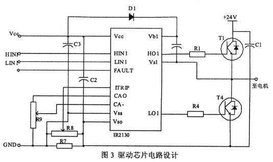 該系統(tǒng)硬件電路設(shè)計重難點在于驅(qū)動逆變電路,轉(zhuǎn)子位置檢測電路和電路保護模塊三大部分。驅(qū)動逆變電路包含驅(qū)動芯片和驅(qū)動橋式電路兩個部分,驅(qū)動芯片采用IR2130驅(qū)動芯片,它是專用的三相橋式電路驅(qū)動芯片,可以直接驅(qū)動中小容量的MOSFET、IGBT、MCT等,而且只需一個供電電源,工作頻率從幾十赫茲到上百千赫茲,內(nèi)部還設(shè)置有過流和欠壓保護使得在驅(qū)動功率管時更加安全可靠。