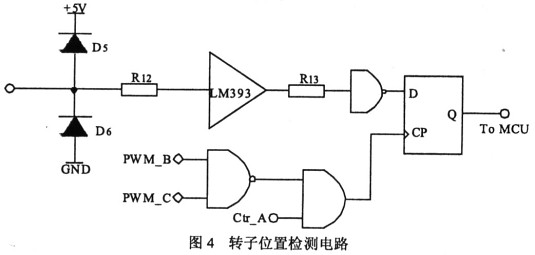轉(zhuǎn)子位置檢測電路用于測取電機反電動勢過零點信息,從而獲得轉(zhuǎn)子位置,而且是通過檢測電機的端電壓來實現(xiàn)的。電路設(shè)計如圖4所示。