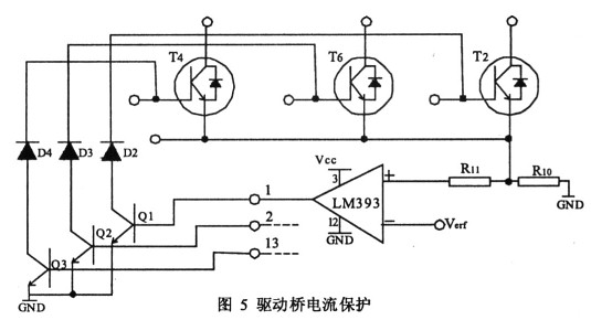 保護電路通過R10于Rll將驅(qū)動橋下橋臂的電壓采集到LM393的正向輸入端,可以和事先設(shè)定的Verf進行比較,當(dāng)驅(qū)動橋電流過大時,LM393輸出高電平,使得Q1、Q2、Q3都導(dǎo)通,由此降低下橋臂MOS管的柵源電壓,達到保護MOS管的目的。