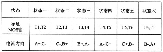 MCU輸出控制信號控制三相全橋驅(qū)動逆變電路,在軟件實現(xiàn)上可以采用不同的控制規(guī)律,常用的控制方式有:三三導(dǎo)通控制方式,兩三輪流導(dǎo)通控制方式和1200導(dǎo)通型控制方式。它們在控制性能上相差不大,本系統(tǒng)采用1200導(dǎo)通型控制方式,控制規(guī)律為:(1)每隔600換流一次;(2)任何時候只有兩只開關(guān)器件同時導(dǎo)通;(3)每個開關(guān)器件導(dǎo)通1200根據(jù)硬件電路的設(shè)計和1200導(dǎo)通型控制規(guī)律,橋臂與MOS管對應(yīng)關(guān)系為:A上橋臂:Tl,A下橋臂:T4;B上橋臂:T3,B下橋臂:T6;C上橋臂:T5,C下橋臂:T2。各MOS管導(dǎo)通順序如表2所示。
