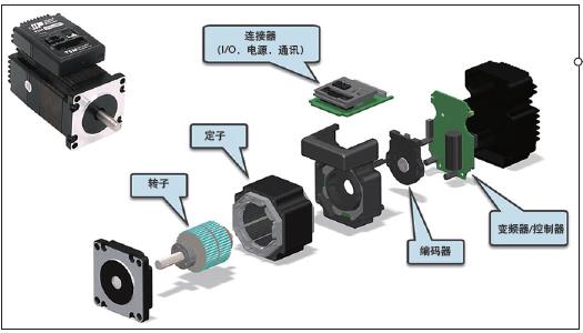圖2:機電一體化的主要示例是將電機和變頻器組件組合到一個封裝中。集成步進電動機的分解圖展示了該技術,該技術也適用于其它類型的電機。圖片來源:Applied Motion