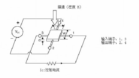 如下圖釋,控制電流由適用厚度的半導(dǎo)體材料d經(jīng)過端子1和3,在應(yīng)用磁場之上,帶有磁通密度B垂直于半導(dǎo)體薄片,電位差顯現(xiàn)于端子2和4。VH為霍爾輸出電壓,表示為: