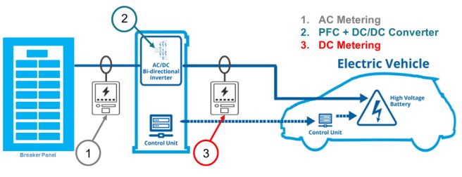 ·直流計量。直流充電器可以有多種類型的架構,因為它們的可堆疊電源模塊能夠提高或降低充電裝置的額定功率。如圖 1 所示,直流充電器的輸出端有時會有一個最終計量點(被稱為直流計量),用于測量進入車輛的電壓,確保消費者無需為直流充電器與車載充電插座之間的耗散功率付費。