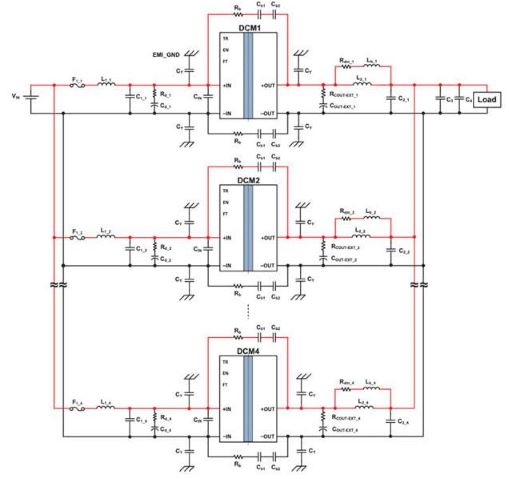 在陣列模式下使用 DCM2322 模塊時(shí),需要在設(shè)計(jì)上進(jìn)行權(quán)衡:用一個(gè)去耦網(wǎng)絡(luò)來實(shí)現(xiàn)并聯(lián)運(yùn)行。實(shí)際上,這意味著每個(gè) DCM2322 只需在輸出被饋入公共總線之前安裝一個(gè)輸出電容器。即使所有模塊共用一個(gè)輸入電壓源,每個(gè) DCM2322 也需要一個(gè)單獨(dú)的輸入濾波器。濾波器用于限制每個(gè)模塊反射的紋波電流,并協(xié)助抑制拍頻電流的產(chǎn)生,當(dāng)允許多個(gè)動(dòng)力輸入級直接相互作用時(shí),可能會(huì)產(chǎn)生拍頻電流(圖 4)。