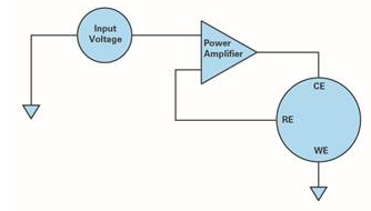 最基本和常用的測量原理是基于恒電勢器。如圖1所示,恒電勢器測量和控制工作電極(WE)和參考電極(RE)之間的電壓。通過調節流過計數器或輔助電極的電流,工作電極的電勢相對于參考電極保持恒定。