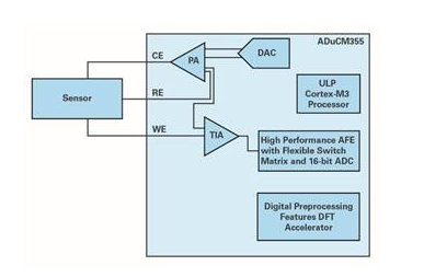 最簡單的電流測量方法是對傳感器施加偏置電壓并測量響應電流。其中,在RE和WE之間施加一個恒定電壓,然后使用電流-電壓轉換器和模數轉換器(ADC)將電流剖面轉換為數字信號。這個電流剖面取決于傳感器和被測變量。圖2利用ADuCM355描述了這個電路。