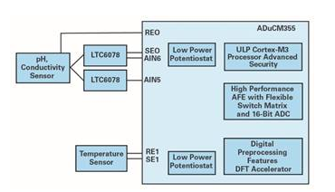 圖5.使用ADuCM355測量pH值、溫度和電導率的電路
