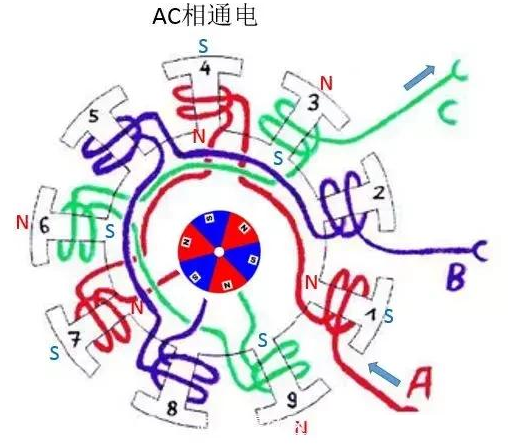 分析方法也和內(nèi)轉(zhuǎn)子電機(jī)類似,大家可以自己分析一下,根據(jù)右手螺旋定理判斷線圈的N/S極,轉(zhuǎn)子永磁體的N極與定子繞組的S極有對齊(吸引)的趨勢,轉(zhuǎn)子永磁體的S極與定子繞組的N極有對齊(吸引)的趨勢,從而驅(qū)動電機(jī)轉(zhuǎn)動。