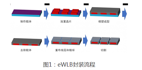 有一種先進封裝技術被稱為“晶圓級封裝”(WLP),即直接在晶圓上完成集成電路的封裝程序。通過該工藝進行封裝,可以制成與原裸片大小近乎相同的晶圓。早在2000年代末,英飛凌開發的嵌入式晶圓級球柵陣列(eWLB)就是一種晶圓級封裝技術。目前有許多封測代工廠(OSAT)都在使用eWLB的變種工藝。具體來說,eWLB封裝是指將檢驗合格的晶片正面朝下,放置在載體晶圓上并將兩者作為整體嵌入環氧樹脂模具。在模鑄重構晶片結構之后進行“扇出型”封裝,在暴露的晶圓表面進行重布線層工藝(RDLs)并植球,之后再將其切割成小塊即可獲得可供使用的芯片(圖1)。