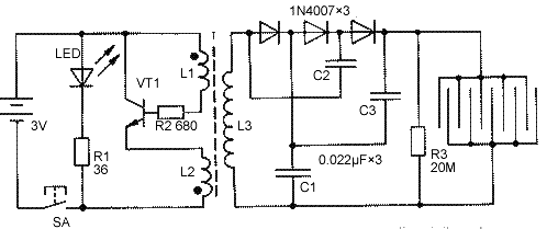 當(dāng)按下電源開關(guān)SA時(shí),由三極管VT1和升壓變壓器T構(gòu)成的高頻振蕩器通電工作,把3V直流電變成18kHz左右的高頻交流電,經(jīng)T升壓到約500V,再經(jīng)三支1N4007二極管、電容器C1~C3組成的三倍壓整流電路升高到1500V左右,加到特制的金屬網(wǎng)上。當(dāng)蚊蠅觸及金屬網(wǎng)絲時(shí),高壓就會(huì)通過蟲體放電,將蚊蟲擊斃。