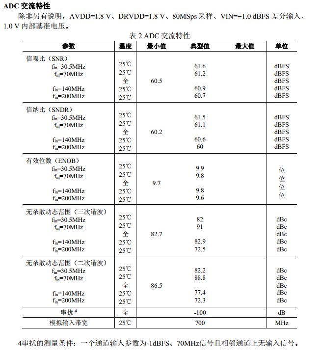 SC9204 是一款單芯片、雙通道、10 位、20MSPS/40MSPS/65MSPS/80MSPS 模數轉換器(ADC),采用 1.8V 電源供電,內置高性能采樣保持電路和片內基準電壓源。該產品采用多級差分流水線架構,內置輸出糾錯邏輯,在 80 MSPS 數據速率時可提供 14 位精度,并保證在整個工作溫度范圍內無失碼。該 ADC 內置多種功能特性,可使器件的靈活性達到最佳、系統成本最低,例如可編程時鐘與數據對準、生成可編程數字測試碼等。可獲得的數字測試碼包括內置固定碼和偽隨機碼,以及通過串行端口接口(SPI)輸入的用戶自定義測試碼。采用一個差分時鐘輸入來控制所有內部轉換周期。數字輸出數據格式為偏移二進制、格雷碼或二進制補碼。每個 ADC 通道均有一個數據輸出時鐘(DCO),用來確保接收邏輯具有正確的鎖存時序。該器件支持 1.8V 和 3.3V 兩種 CMOS 電平,輸出數據可以在單條輸出總線上多路復用。SC9204 采用符合 RoHS 標準的 64 引腳的 QFN 封裝。