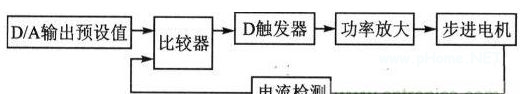 圖3為自激式恒電流斬波驅動框圖。把步進電機繞組電流值轉化為一定比例的電壓,與D/A轉換器輸出的預設值進行比較,控制功率管的開關,從而達到控制繞組相電流的目的。從理論上講,自激式恒電流斬波驅動可以將電機繞組的電流控制在某一恒定值。但由于斬波頻率是可變的,會使繞組激起很高的浪涌電壓,因而對控制電路產生很大的干擾,容易產生振蕩,可靠性大大降低。