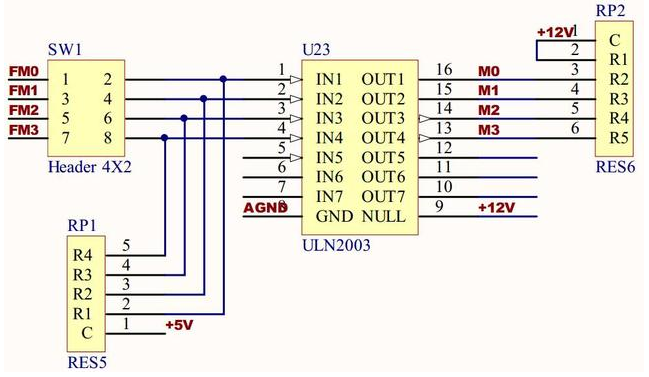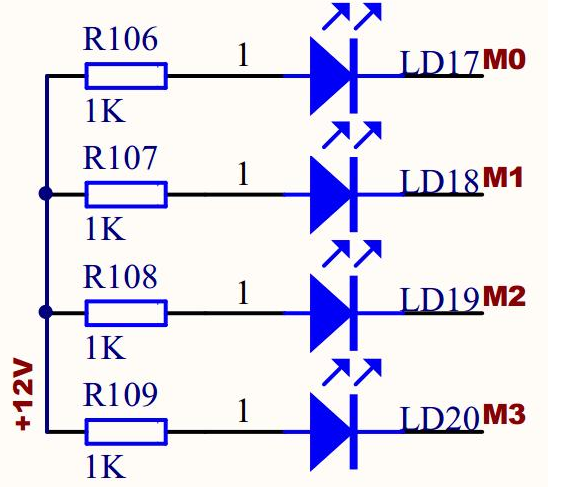 電機部分指示燈用于指示各路信號的邏輯電平狀態(tài),其中R106~109為限流電阻,防止發(fā)光二極管因電流過大燒毀。值得注意的是:該指示燈的發(fā)光二極管接成共陽極,由M0~3信號端口產(chǎn)生低電平點亮對應(yīng)的二極管,而ULN2003的OUT與IN邏輯電平相反,因此對于I/O口
