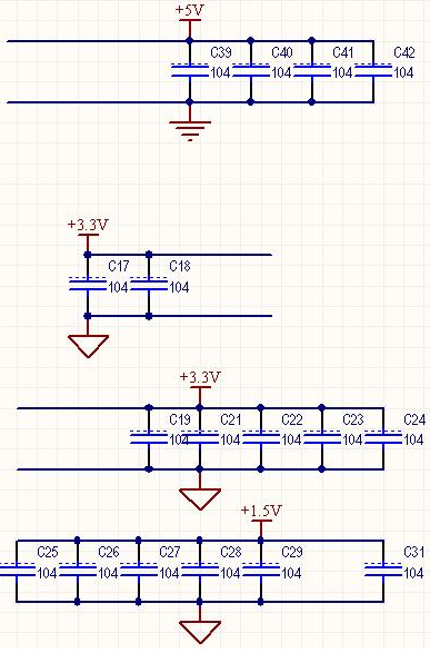 從圖1-1中可知道供電有+5V、+3.3V、+1.5V三種,其中每個電源均有0.1μF的旁路電容,將電源中的高頻串?dāng)_旁路到地,防止高頻信號通過電源串?dāng)_到其它模塊中。同時還能將電源本身的工頻干擾濾除。