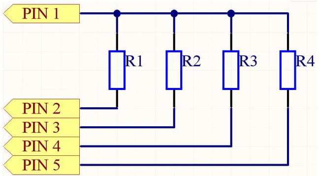 RES5是五端口排阻,內(nèi)部集成了4個等阻值且一端公共連接的電阻,PIN 1是公共端,PIN2~5為排阻的輸出端,排阻原理圖如圖2-2所示: