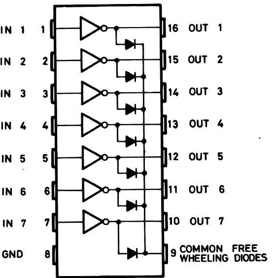 芯片ULN2003內(nèi)部集成7組達(dá)林頓管,專門用于提高驅(qū)動電流,芯片引腳間邏輯如圖2-3所示:
