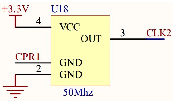 采用50Mhz有源晶振產(chǎn)生時鐘信號,接法采用有源晶振的典型接法:PIN 1懸空,PIN 2接地,PIN 3輸出時鐘信號,PIN 4接電源。由于FPGA的I/O供電為3.3V,而時鐘電路產(chǎn)生的時鐘信號要由I/O口接收,因此時鐘信號最大值不能超過3.3V,故時鐘電路電源采用3.3V供電