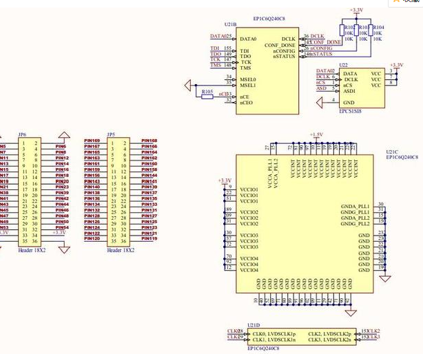 U21B為JTAG與AS下載部分,TMS、TCK、TD1、TD0分別為JATAG下載方式的模式選擇端、時鐘信號端、數(shù)據(jù)輸入端、數(shù)據(jù)輸出端。DATA0為AS下載的數(shù)據(jù)端口,MSEL0、MSEL1、nCE、nCEO、CONF_ DONE、nCONFIG、nSTATUS端口按照典型接法相連。值得注意的是:無論AS還是JTAG都是通過JTAG標(biāo)準(zhǔn)通訊,AS下載一般是下載POF到