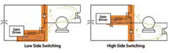 目前,大功率半導體器件(如IGBT和MOSFET)的發展趨勢是在提升性能的前提下不斷縮小芯片尺寸。減小芯片尺寸能減少器件的寄生電容,從而提高開關速率。因此,深入研究電路板上的關鍵回路越來越重要。圖1為電壓源變頻器(voltage source inverter,VSI)的兩種典型開關工作方式的簡化示意電路。在開關頻率受限的大電流應用中,IGBT是最受歡迎的器件。上圖所示為從高壓側(HS)續流二極管到低壓側IGBT的換流。電流最初是在高壓側二極管和相應反相半橋的IGBT形成的續流通道中。