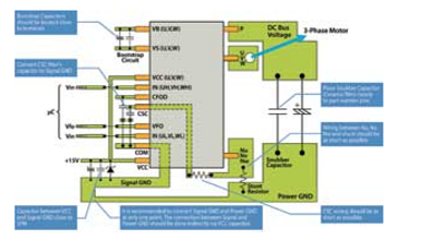 與電壓源變頻器的分立元件方案類似,采用智能功率模塊時也要注意外部元件的布局安排。圖3所示為針對Motion-SPMTM應用的一些建議。由于電壓源變頻器的開關速率很快,信號接地和功率接地必須分開。兩種接地在15V Vcc電容處互接。Vcc電容和功率接地之間的通道要狹窄,以去除耦合。為防止電涌造成破壞,引腳P與功率接地之間應當有一個低電感電容。另外,由于電壓源變頻器和馬達之間的長引線會造成高壓反射,因此一些SPM產品配備了外接柵極電阻來調節開關速率和最大限度地減少反射。