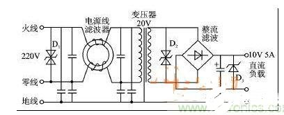 圖1為微機電源采用TVS管作線路保護的原理圖。