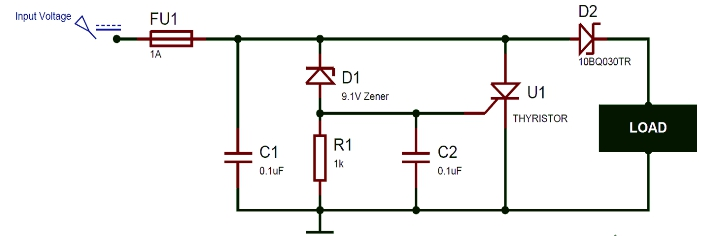 而何種電壓下產生短路則取決于齊納電壓。電路由一個晶閘管構成,晶閘管會直接連在輸入電壓和地之間,但晶閘管因為門極接地所以默認為關斷狀態。當輸入電壓超過齊納電壓后,齊納二極管導通,因此電壓加到晶閘管門極,使得輸入電壓與地之間產生短路。短路會從電源中產生龐大的電流,從而熔斷保險絲,使得負載與電源斷開。