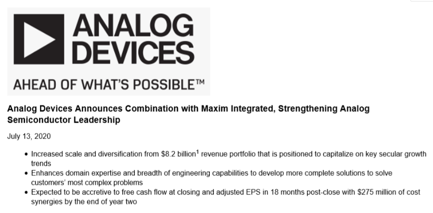 去年7月 ,ADI公司在其官網宣布該公司與Maxim Integrated公司就合并一事已達成最終協議,ADI將以全股票交易方式收購Maxim。