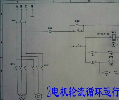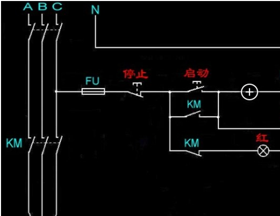 按下啟動鍵,KM線圈得電,KM常開輔助觸點自鎖,綠燈亮,電機運行;按下停止按鈕,KM線圈失點,輔助觸點復位,紅燈亮,電機停止。