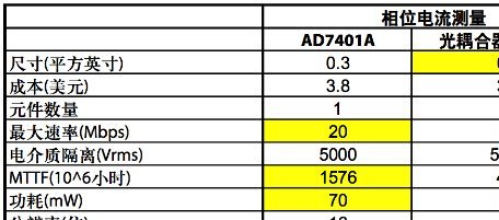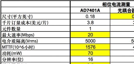 多數高級電機驅動以電機相位電流為主反饋。為了提供連續的反饋,將超低電阻分流電阻與電機相位串聯起來。然而,這會增加電路的復雜性,因為需要測量毫伏級的信號以及以快速dv/dt高頻切換的百伏級共模電壓擺幅。對于這種設計,兩個AD7401A隔離式Σ-Δ調制器用來測量電機繞 組電流,數字位流則由ADSP-CM40x上的數字過濾電路進行處理。ADSP-CM40x的內置sinc濾波器允許與隔離式Σ-Δ型調制器實現無縫連接。第三相電流可以基于另外兩相電流以數學方法計算得到,以減少功耗、降低元件成本。AD7401A在單封裝中集成了一個差分采樣保持級、一個Σ-Δ調制器和數字隔離機制。高電壓端模擬信號被轉換成一個數字串行數據流,然后通過隔離柵傳輸至低電壓端。 AD7401A還含有一個時鐘輸入引腳,只需一個時鐘源,即可同時對各器件進行測量。正如表2所示,市場上的確存在集成度和成本類似的光耦合器;然而,數字隔離器技術在功耗、速度和可靠性方面的表現仍然更加突出,這是與器件的基礎結構相關的,更不用說AD7401A出色的調制器性能。