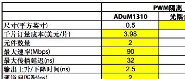 例如,控制器將在開關信號之間引入停滯時間,以防止任何高端和低端晶體管對同時傳導(即直通)。停滯時間為功率開關的開啟和關閉延遲以及隔離電路所致延遲的不確定性的函數。ADuM1310數字隔離器的通道間匹配時間僅為2 ns,光耦合器則高達500 ns。采用數字隔離器可以大幅縮減停滯時間,從而提高功率逆變器的性能。另外,如比較表中所示,除了性能以外,ADuM1310還是一種集成度更高的解決方案,可以減少元件數量和物料成本。