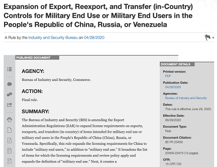 按美國商務部的新規,美國公司不僅向軍事實體出售科技產品必須獲取許可,而且包括民用。其中就明確取消了集成電路、電信設備等美國技術的出口。更值得注意的是,新規中美國企業要提交所有出口中國的商品名單,即使其他國家出口美國商品到中國,也要征得美國同意。