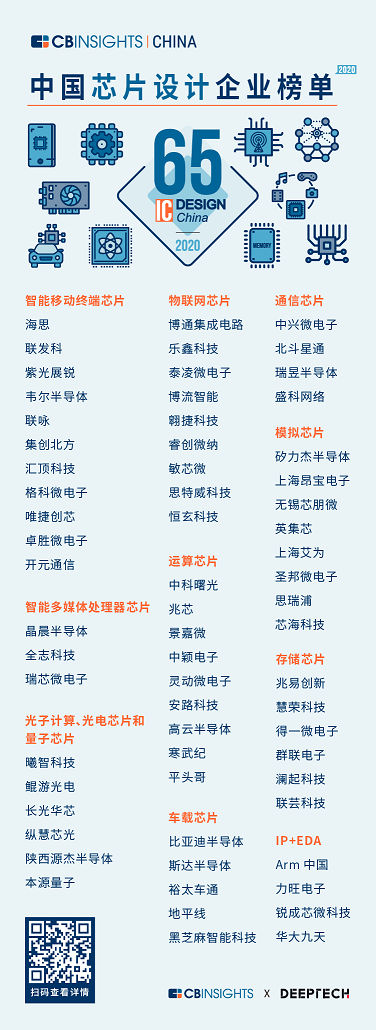 4 月 29 日,CB Insights 首次發布中國芯片設計企業榜單,65 家中國芯片設計企業上榜。在該榜單共分為 10 個類別,分別為智能移動終端芯片、通信芯片、物聯網芯片、智能多媒體處理器芯片、存儲芯片、模擬芯片、光子計算、光電芯片和量子芯片、運算芯片、車載芯片,IP+EDA。