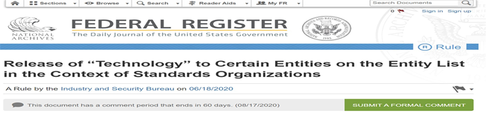 6月18日,美國商務部工業和安全局(BIS) 在《聯邦公報》上發布了新的臨時最終規則,該規則對《出口管理條例》(EAR)(15 CFR第730-774部分)進行了修正,“實體清單”中由華為組織指定與建立5G應用標準有關的技術將附加許可要求排除在外。