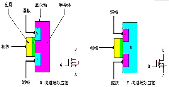 從結(jié)構(gòu)圖可發(fā)現(xiàn),N溝道型場(chǎng)效應(yīng)管的源極和漏極接在N型半導(dǎo)體上,而P溝道型場(chǎng)效應(yīng)管的源極和漏極則接在P型半導(dǎo)體上。場(chǎng)效應(yīng)管輸出電流由輸入的電壓(或稱場(chǎng)電壓)控制,其輸入的電流極小或沒有電流輸入,使得該器件有很高的輸入阻抗,這也是MOS管被稱為場(chǎng)效應(yīng)管的重要原因。