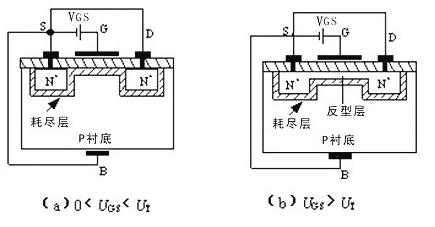 如果進(jìn)一步提高VGS電壓,使VGS達(dá)到某一電壓VT時(shí),P襯底表面層中空穴全部被排斥和耗盡,而自由電子大量地被吸引到表面層,由量變到質(zhì)變,使表面層變成了自由電子為多子的N型層,稱為“反型層”,如圖表3(b)所示。