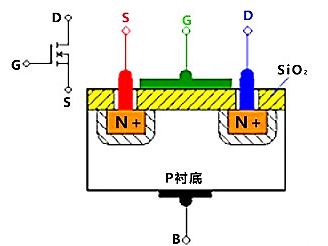 N溝道增強(qiáng)型MOS管在P型半導(dǎo)體上生成一層SiO2薄膜絕緣層,然后用光刻工藝擴(kuò)散兩個(gè)高摻雜的N型區(qū),從N型區(qū)引出電極(漏極D、源極S);在源極和漏極之間的SiO2絕緣層上鍍一層金屬鋁作為柵極G;P型半導(dǎo)體稱為襯底,用符號(hào)B表示。由于柵極與其它電極之間是相互絕緣的,所以NMOS又被稱為絕緣柵型場(chǎng)效應(yīng)管。