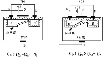 當(dāng)VDS增大到某一臨界值,使VGD≤VGS(th)時(shí),漏端的溝道消失,只剩下耗盡層,把這種情況稱為溝道“預(yù)夾斷”,如圖表4(a)所示。繼續(xù)增大VDS[即VDS>VGS-VGS(th)],夾斷點(diǎn)向源極方向移動(dòng),如圖表4(b)所示。