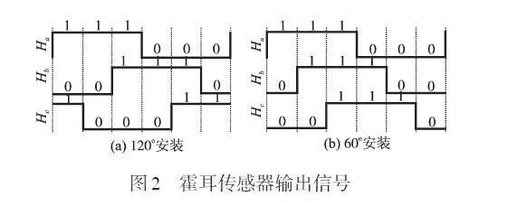 霍爾傳感器常用來檢測無刷直流電機換相點。三相無刷直流電機需要3 個霍爾傳感器來檢測6 個不同的位置,霍爾傳感器的安裝有120° 安裝和60° 安裝2 種方式,120° 安裝指3 個霍爾傳感器互差120° (電角度),而60°安裝指3 個霍爾傳感器互差60° (電角度),2 種安裝方法對應霍爾傳感器的輸出信號如圖2 所示,圖2 中霍爾信號跳變的位置就是換相點。2 種安裝方式最大的區別在于采用60 ° 安裝時可以輸出“000”和“111”信號,而120° 安裝則不會輸出這2 個信號,通過這一點可以判斷霍爾傳感器的安裝方式。