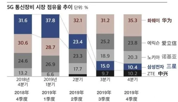 ? 但隨著2019年美國、歐洲、中國的運營商陸續商用5G,三星的5G設備市場份額下滑至10.4%,被華為、愛立信和諾基亞超越。