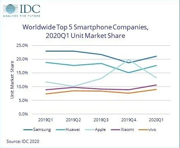 蘋果手機銷售步履維艱,但它只是全球手機市場的一個縮影。根據(jù)IDC發(fā)布的2020年第一季度全球智能手機市場數(shù)據(jù),第一季度全球智能手機出貨量同比下降11.7%至 2.758億部。