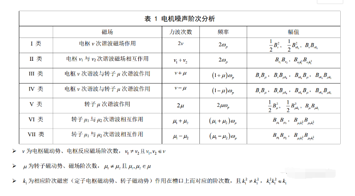 電機氣隙磁場相互作用產(chǎn)生隨時間和空間變化的電磁力波,這種電磁力波將引起電機定子和殼體產(chǎn)生振動。定子與殼體的振動進而又引起周圍空氣的振動即產(chǎn)生電磁噪聲。特別是當(dāng)電磁力波的空間階數(shù)與頻率分別與定子結(jié)構(gòu)模態(tài)振型與頻率接近時,將會引起嚴(yán)重的共振。