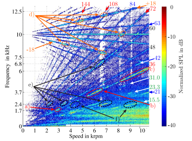 第二處36階在3.7KHz,如圖中b處。作者提及電機單體測試時,在此處及傳遞路徑中并沒有發(fā)現(xiàn),但在與總成測試過程中,發(fā)現(xiàn)在在齒輪端出現(xiàn)了此噪聲,由此可以推測為電機扭轉(zhuǎn)引起總成噪聲變化。