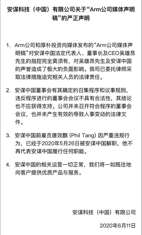 1.Arm公司和厚樸投資向媒體發布的“Arm公司媒體聲明稿”對安謀中國法定代表人、董事長及CEO吳雄昂先生的指控完全莫須有,對吳雄昂先生及安謀中國的聲譽造成了極大的負面影響。我司已委托律師采取法律措施追究相關人員的法律責任。