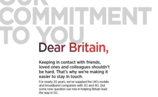 華為在《我們對(duì)你們的承諾》廣告中稱:“近20年來(lái),我們?yōu)橛?guó)的移動(dòng)和寬帶公司提供了3G、4G網(wǎng)絡(luò),但是一些人現(xiàn)在質(zhì)疑我們?cè)趲椭?guó)引領(lǐng)5G部署方面所扮演的角色。華為將繼續(xù)一如既往地為你們的網(wǎng)絡(luò)運(yùn)營(yíng)商提供最好的設(shè)備,這樣你們就可以分享照片、觀看流媒體電影。”
