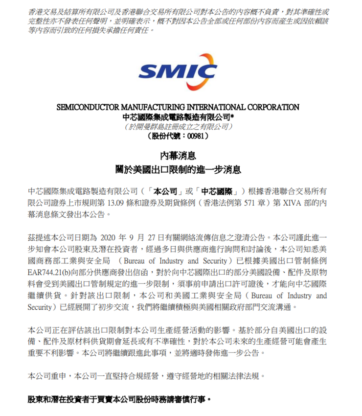 據中芯國際最新公告顯示,經過多日與供應商進行詢問和討論后,中芯國際知悉美國商務部工業與安全局已根據美國出口管制條例向部分供應商發出信函,對于向中芯國際出口的部分美國設備、配件及原物料會受到美國出口管制規定的進一步限制,需事前申請出口許可證,才能向中芯國際繼續供貨。