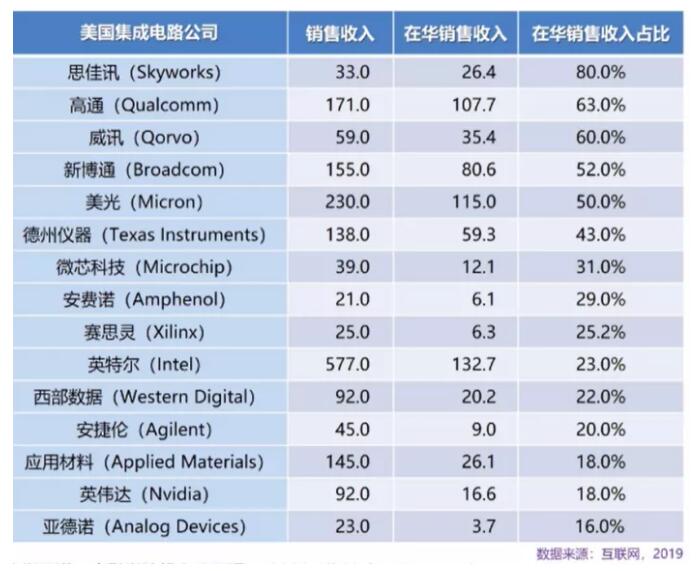 最高占80%!美國主要芯片公司在華銷售占比統計