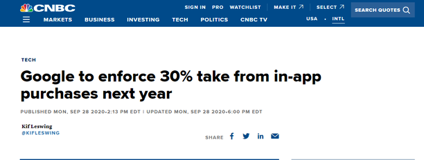 盡管谷歌也宣布了強(qiáng)征30%的分成的這樣一項(xiàng)政策,但似乎卻沒有像蘋果那樣引起廣泛關(guān)注。